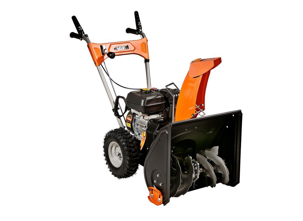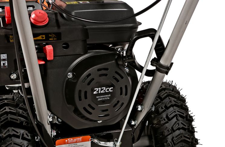 Sturm STG7453 — универсальный самоходный бензиновый снегоуборщик. Предназначен для расчистки территорий от снега различной плотности, как свежевыпавшего, так и слежавшегося. Модель оснащена надежным и неприхотливым четырехтактным двигателем ZONGSHEN, специально адаптированным для зимней эксплуатации, а также многоступенчатой трансмиссией, значительно повышающей универсальность машины. Конструкцией предусмотрены четыре скорости движения вперед и одна назад, выбор нужной скорости производится с помощью удобного рычага переключения. Низшая передача применяется при уборке плотно слежавшегося и мокрого снега, средние передачи — для работы со свежевыпавшим снегом, высшая передача — транспортный режим, предназначенный преимущественно для перемещения снегоуборщика. Высокая производительность машины обеспечивается не только мощным двигателем, но и продуманной конструкцией забора снега — этому способствует использование мощных агрессивных шнеков с большим профилем зуба, позволяющих легко справляться даже со слежавшимся снегом и настом, а также вместительного снегозагребного ковша, гарантирующего внушительную ширину прохода и возможность убирать сугробы до полуметра высотой. Снегоуборщик оснащен выпускным желобом с регулировкой как по направлению, так и углу выброса, благодаря чему пользователь без труда может настроить оптимальное расстояние, на которое будет отбрасываться снежная масса. Максимальная дальность выброса достигает 11 метров. Для лучшего сцепления с поверхностью модель комплектуется специальными шинами с глубоким протектором.