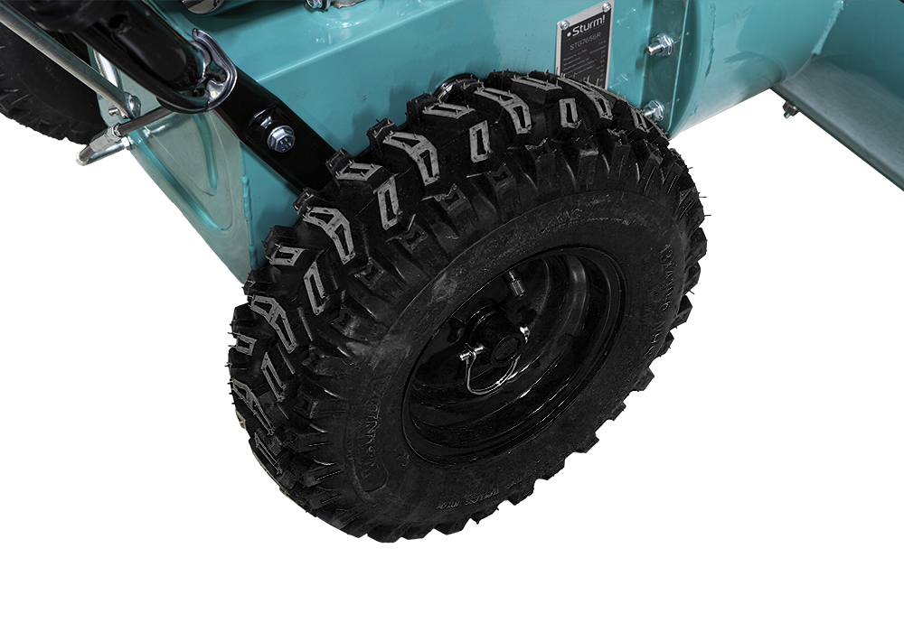 Зазубренный шнек первой ступени успешно измельчает слежавшийся снег и может справиться даже с настом толщиной до 2 см. Высокооборотистая вторая ступень снегоуборочного агрегата отбрасывает снег на расстояние до 12 м. Широкие колеса с развитым анти-снежным протектором позволяют уверенно двигаться по рыхлому снегу.