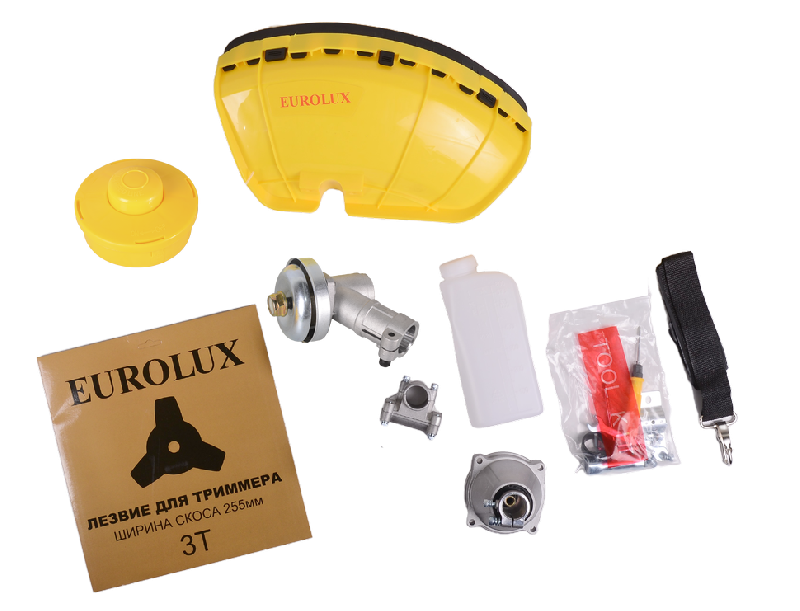 Триммер, Катушка с леской, Нож для травы, Кожух защитный, Плечевой ремень, Элементы для крепежа, Мерный стакан для приготовления топлива, Паспорт