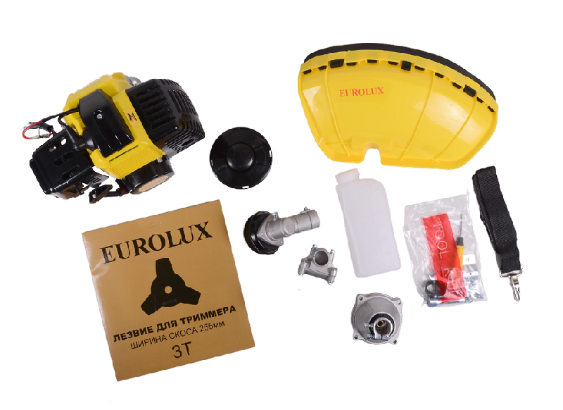 Триммер, Катушка с леской, Нож для травы, Кожух защитный, Плечевой ремень, Элементы для крепежа, Паспорт, Упаковка