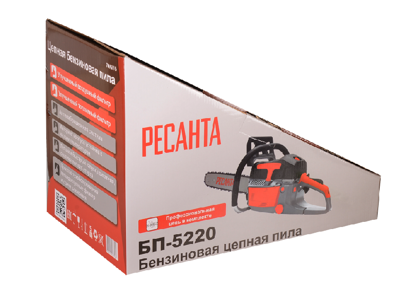 Бензопила БП-5220 Ресанта - прочный и мощный агрегат позволит справиться с задачами любого уровня сложности. Обладает долговечной конструкцией, отличной маневренностью. Резиновые амортизаторы, расположенные между рукоятками и картером пилы, снижают вредную вибрационную нагрузку при работе с бензопилой, делают работу комфортнее. Масляный бак размещается в передней части картера. Принудительная смазка цепи и шины применяется для снижения трения между ними, что увеличивает срок службы пильной гарнитуры. Легкий старт влияет на скорость запуска, особенно в зимний период. Он добавляет дополнительный крутящий момент при рывке. Безопасности в этой модели уделено много внимания. Блокировки курка газа предотвращает случайное нажатие. Функция механического инерционного тормоза цепи также важна: при резком отскоке пилы во время пиления (вверх и назад) рука упирается в ручку тормоза и отщелкивает ее, а тормозная лента затягивается и тормозит барабан сцепления, цепь при этом останавливается практически мгновенно. Защитный щиток в случае разрыва цепи или ее соскока с шины предотвращает травмирование.