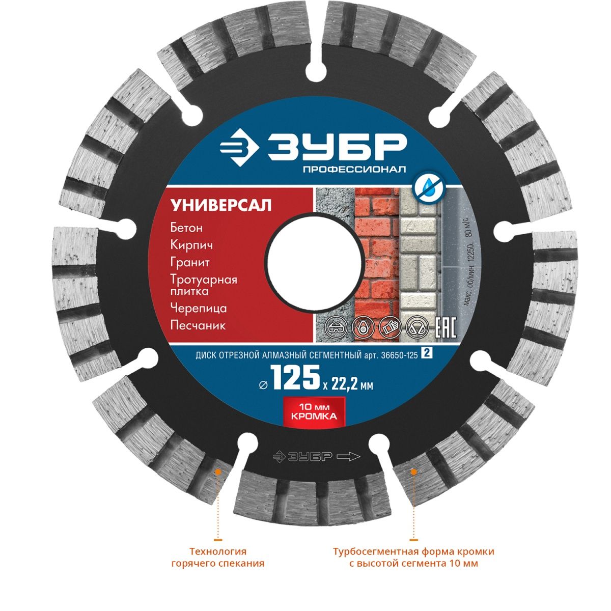 - Оптимально подобранные компоненты металлической связки с высотой сегмента в 10 мм гарантируют продолжительный рабочий ресурс диска при работе даже с самыми сложными в обработке материалами.