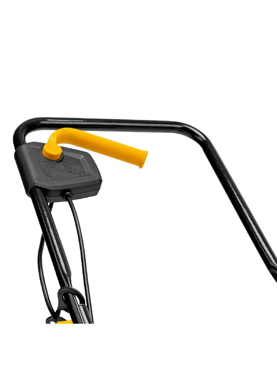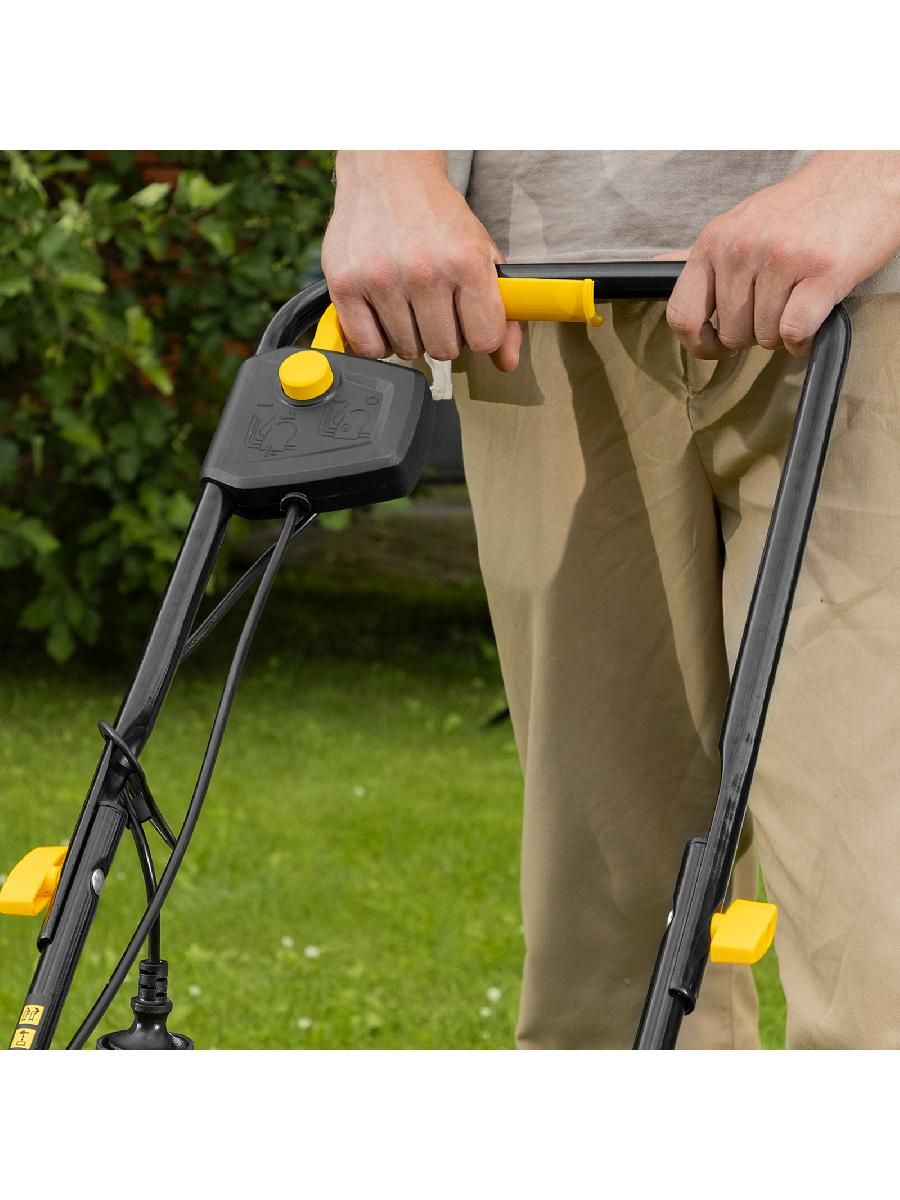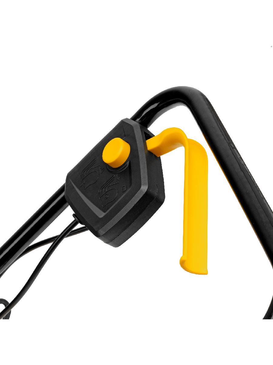 - Безопасность — функция блокировки исключает случайный запуск двигателя, а держатель кабеля предотвращает отключение техники от сети и уменьшает риск попадания провода под нож.