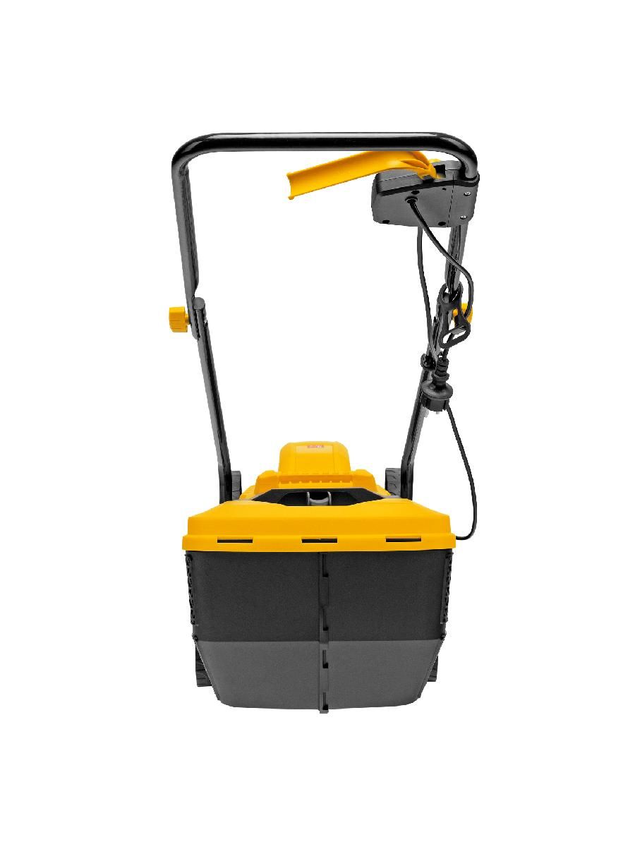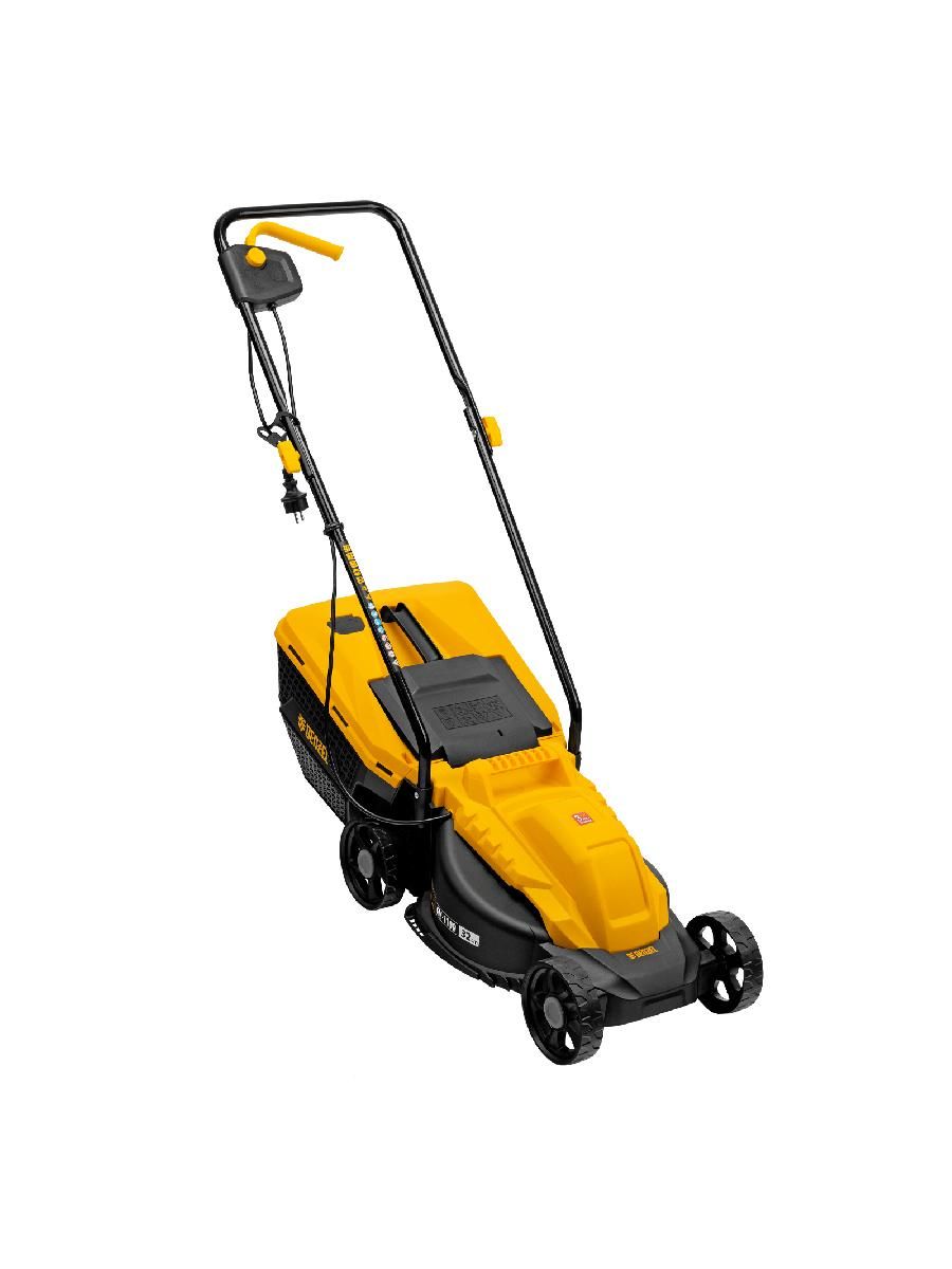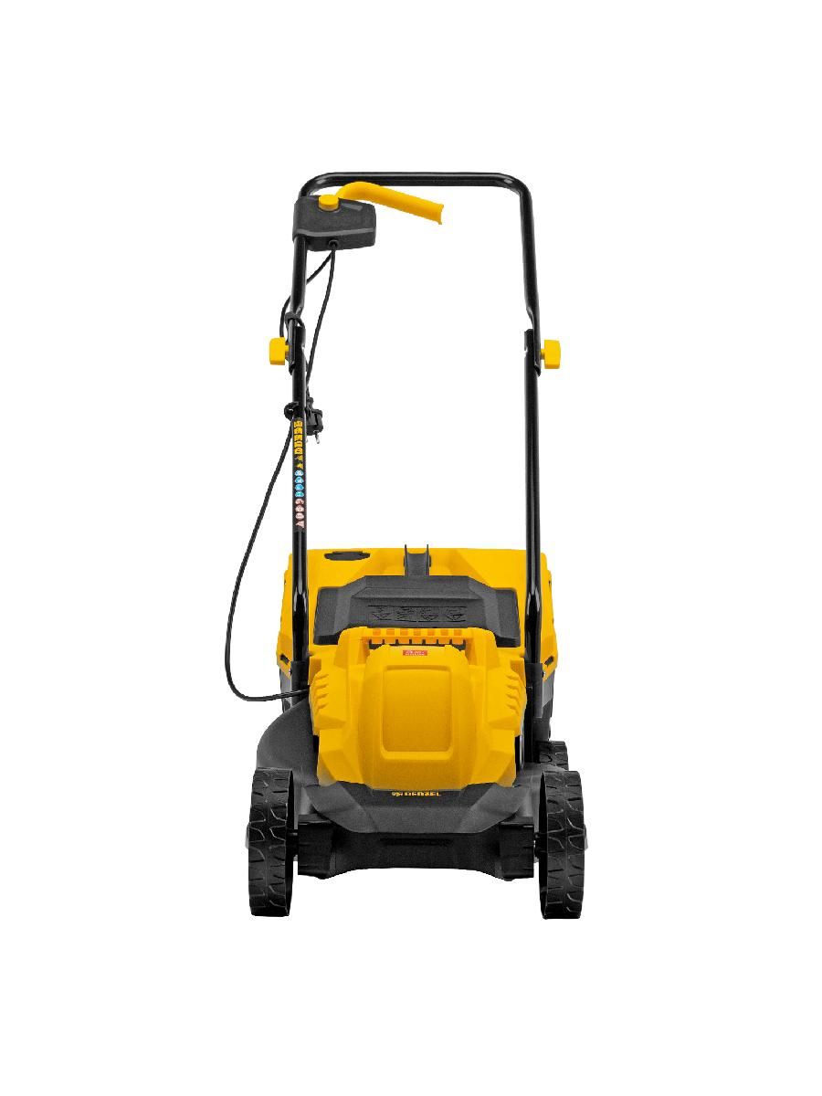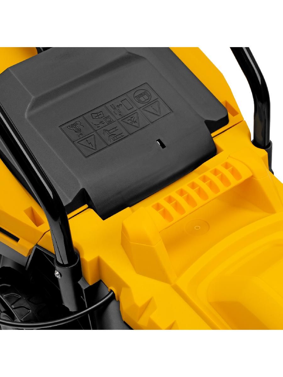- Безопасность — функция блокировки исключает случайный запуск двигателя, а держатель кабеля предотвращает отключение техники от сети и уменьшает риск попадания провода под нож.