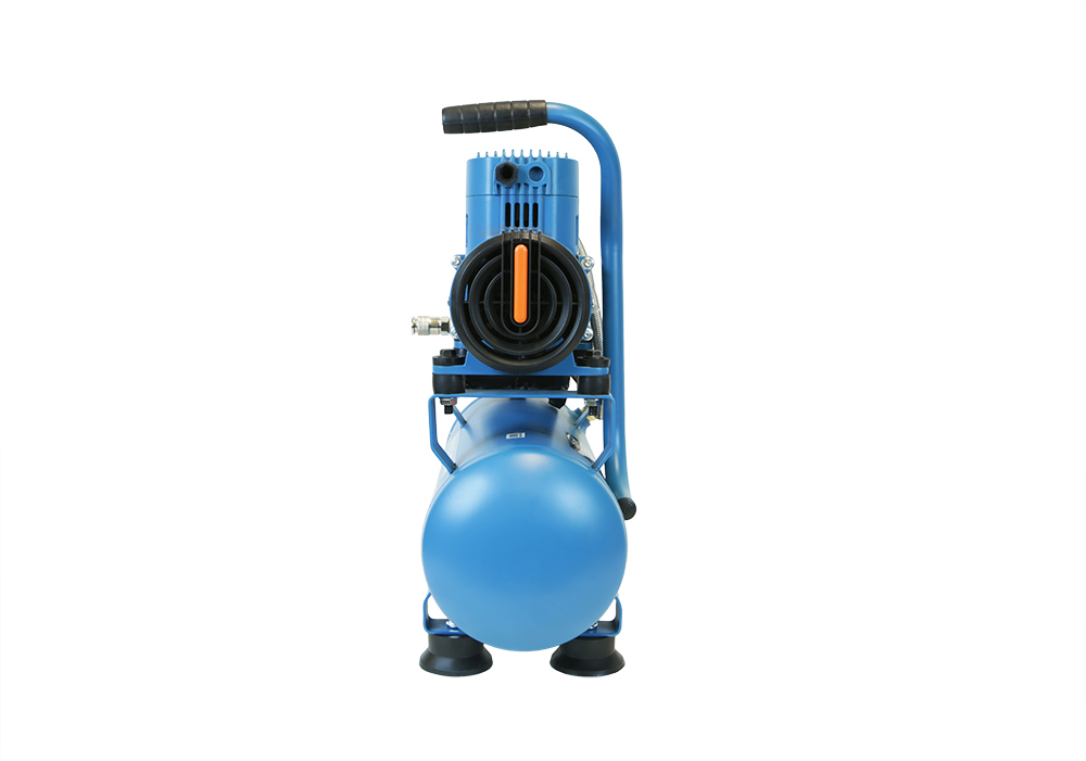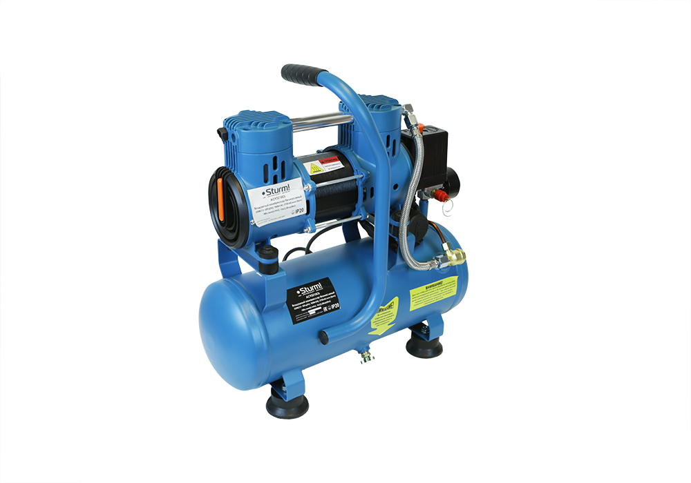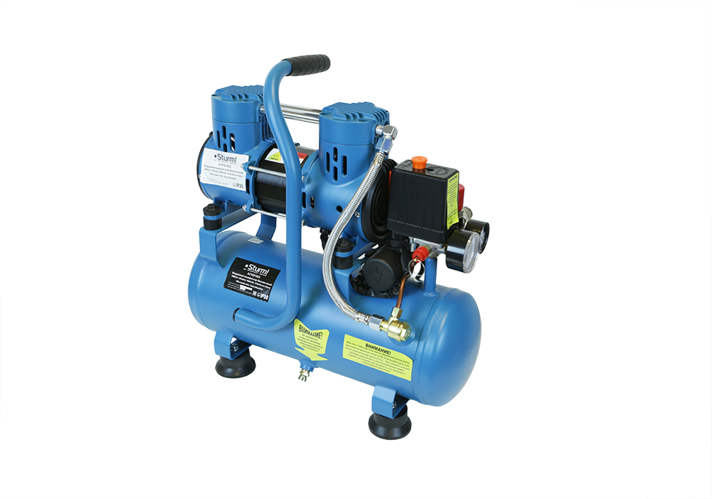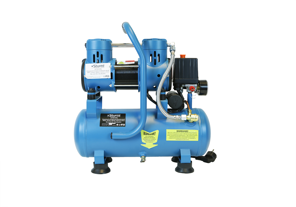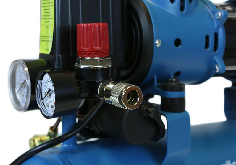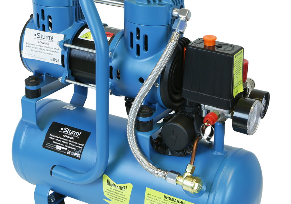 Безмасляный компрессор с 2-х цилиндровым мотором с пониженным уровнем шума, с увеличенным количеством оборотов 2600 об/мин, с двумя шлангами для нагнетания давления обеспечивает поднятие давления в 10-ти литровом ресивере с 0 до 8 атмосфер за 1 минуту;