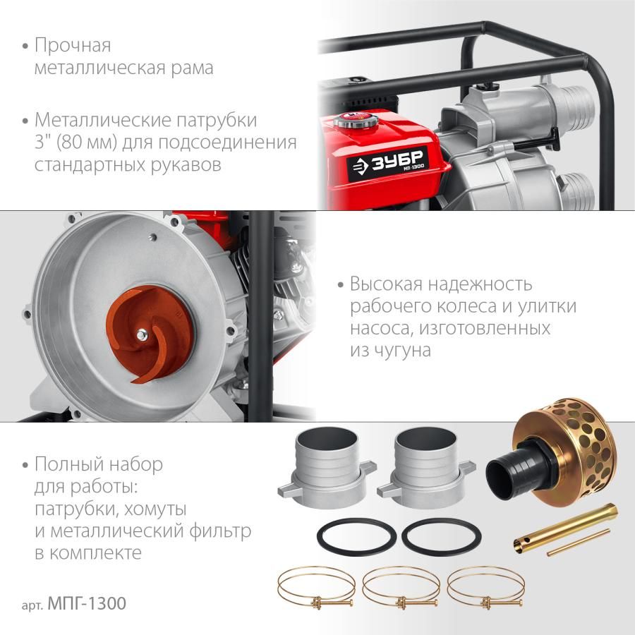 <p>Мощная мотопомпа для перекачивания сильнозагрязненной воды. Обеспечивает высоту напора до 27 м. Идеальна для тяжелых условий работы на стройке</p><h4>Преимущества</h4><ul><li>Возможность работы в сложных условиях стройки для перекачивания сильнозагрязненной воды с абразивными частицами до 30 мм</li><li>Металлические патрубки для присоединения шлангов входят в комплект</li><li>Простой доступ к насосной части благодаря оригинальному крепежу значительно упрощает обслуживание мотопомпы</li><li>Высокая надежность рабочего колеса и улиты насоса, изготовленных из чугуна с добавлением сфероидального графита</li><li>Позволяет проводить работы на участках с большим перепадом высот и откачивать воду из бассейнов</li><li>Возможность работы на площадках с большим взаимным перепадом уровней воды</li><li>Усиленная рама делает оборудование пригодным к использованию в жестких условиях стройки</li></ul><h4>Использование</h4><p>Для откачки (перекачки) воды из водоемов, подвалов, котлованов, емкостей и т.п. Также может использоваться в качестве нагнетающего агрегата для подачи воды при организации полива, заправки емкостей и т.п.</p>