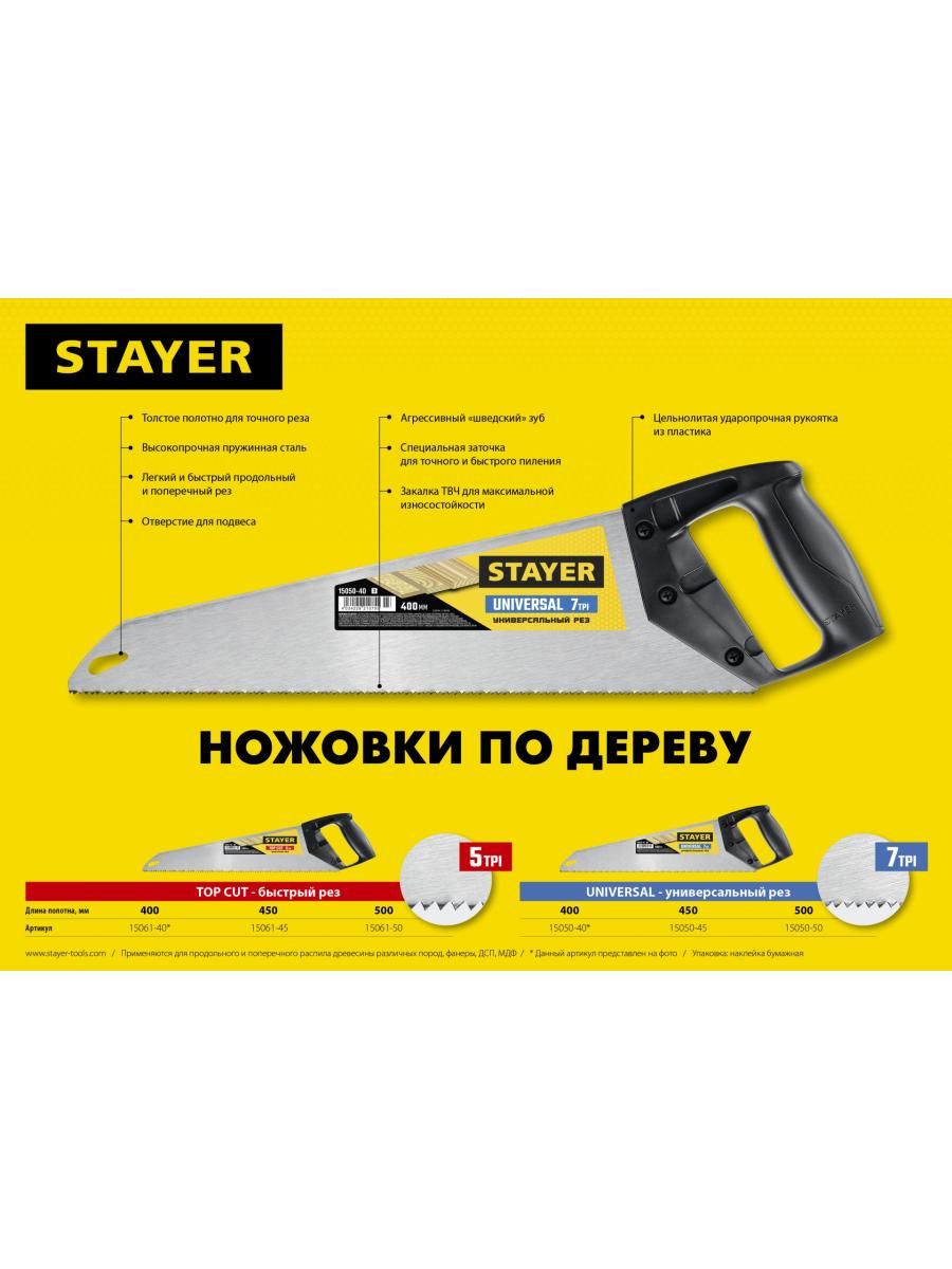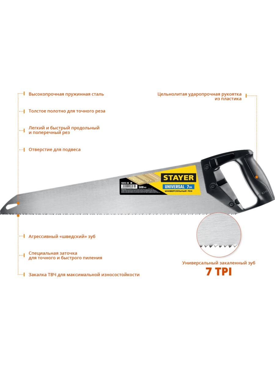 Ножовка с универсальными прямыми закаленными зубьями, остро заточенными с двух сторон, обеспечивает быстрый точный рез вдоль и поперек волокон, для средних заготовок, фанеры, ДСП, МДФ