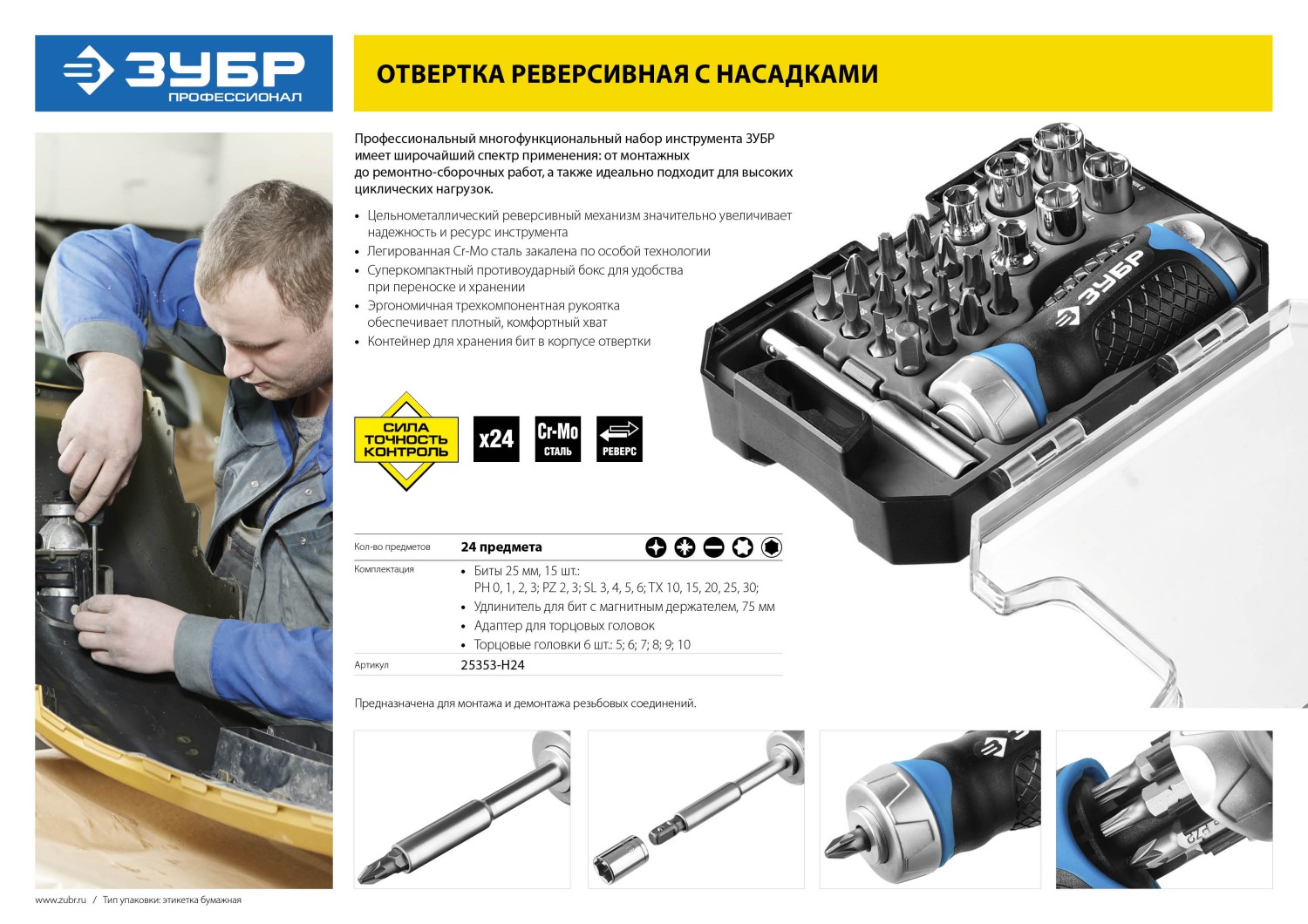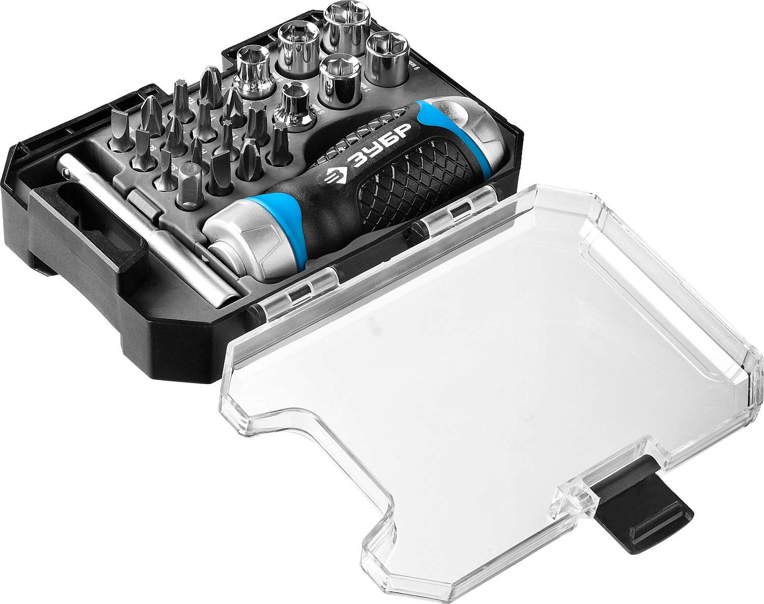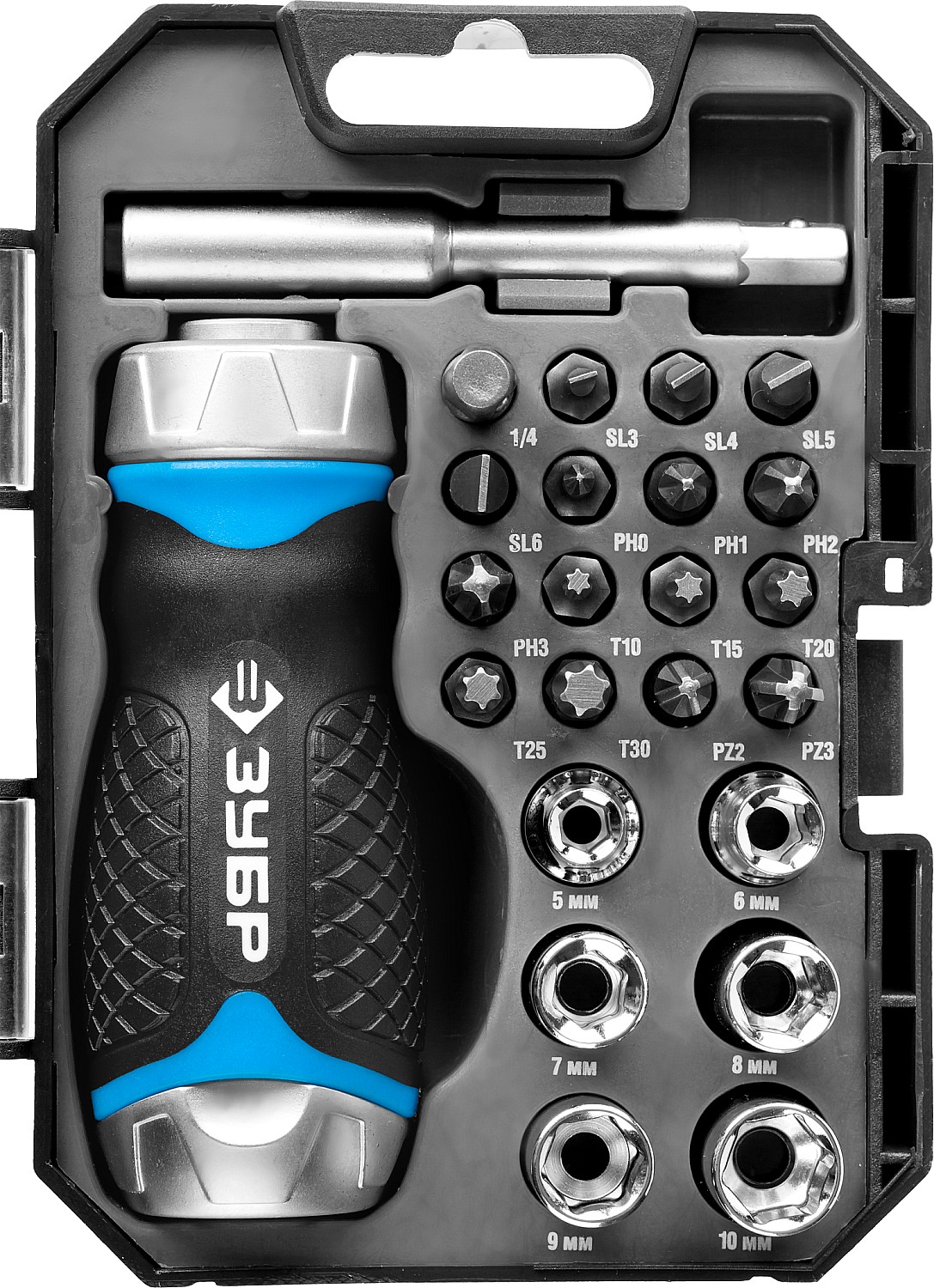 Отвертка реверсивная - 1 шт, Биты 25 мм: PH 0, 1, 2, 3, PZ 2, 3, SL 3 мм, 4 мм, 5 мм, 6 мм, TORX1 0, 15, 20, 25, 30 - 15 шт, Удлинитель для бит с магнитным держателем 75 мм - 1 шт, Адаптер для торцовых головок - 1 шт, Торцовые головки: 5, 6, 7, 8, 9,10 - 6 шт