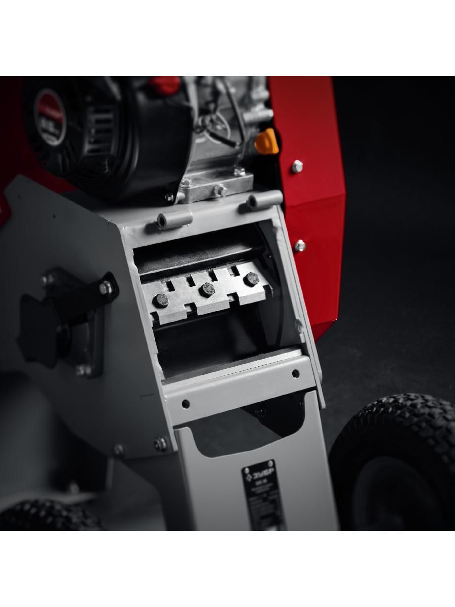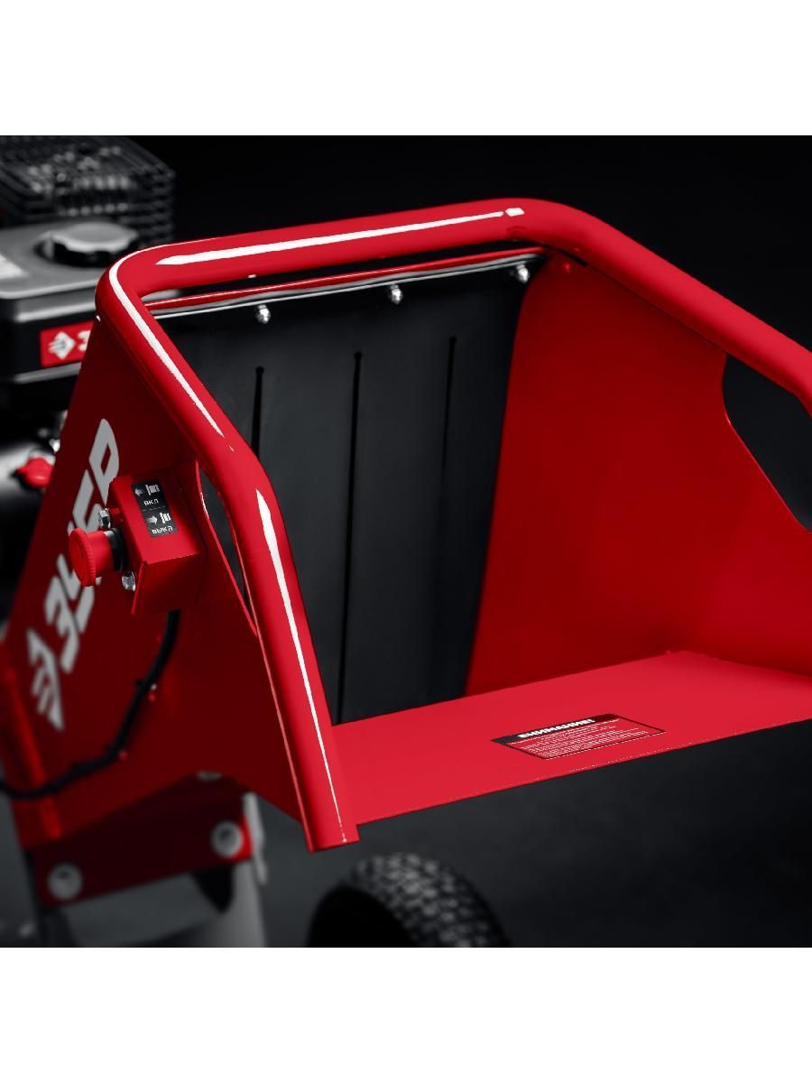 - Широкая горловина загрузочного желоба облегчает загрузку необработанной ветвистой древесины