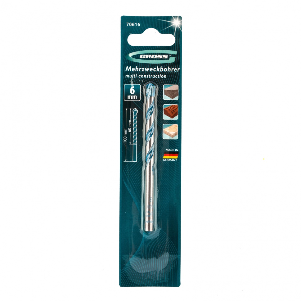Сверло по бетону Gross Multiconstruction Pro 70616 позволяет получать в камне, бетоне и кирпиче отверстия диаметром 6 мм. Подходит для работ по металлу и дереву, поэтому сверлом можно подряд сверлить разные материалы без замены оснастки. Насадка будет полезна во время строительства и ремонта, а также пригодится в быту.ПреимуществаПрочность — сверло выполнено из высоколегированной стали и прошло индукционную закалку, поэтому выдерживает динамические нагрузки.Высокий ресурс работоспособности — режущая пластина из сплава карбида вольфрама твердостью 80-90 HRC, прошедшая алмазную заточку, изготовлена компанией Ceratizit, что подтверждает ее надежность.Устойчивость к ударным нагрузкам — твердосплавная пластина надежно закреплена высококачественным припоем.Эффективность — продуманная форма спирали способствует быстрому удалению продуктов сверления, что повышает производительность сверла и увеличивает срок его службы.Гарантированное качество — сверло изготовлено на высокотехнологичном заводе в Германии.