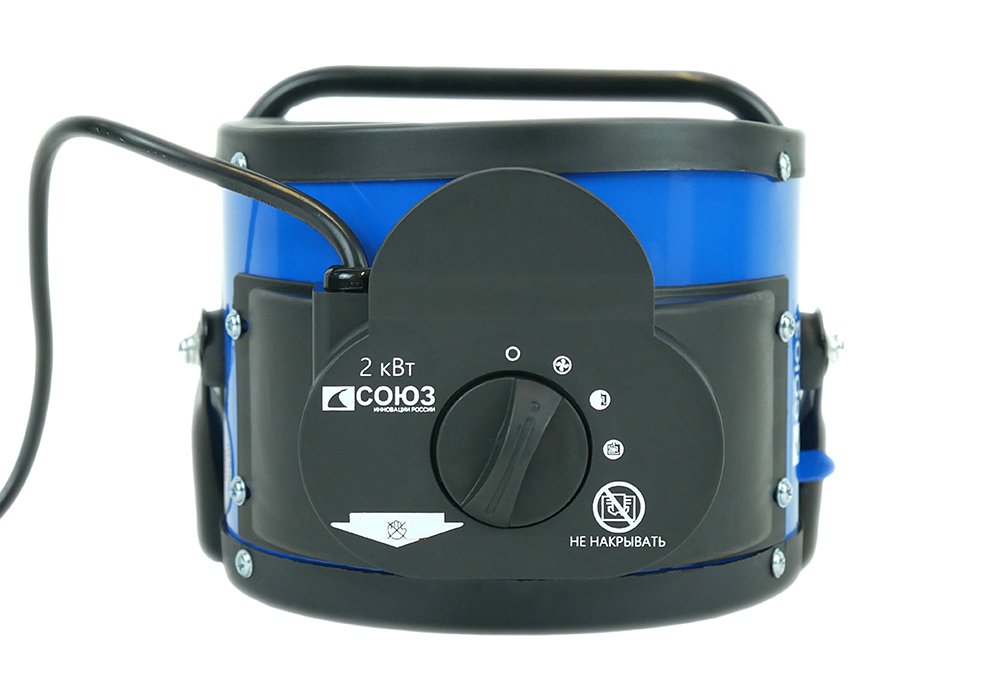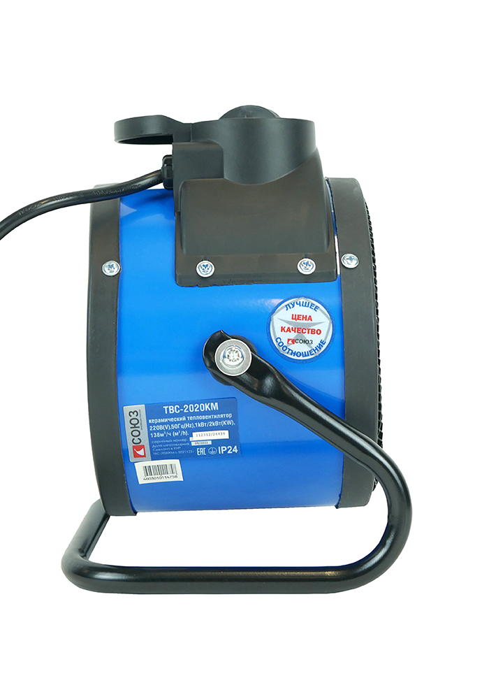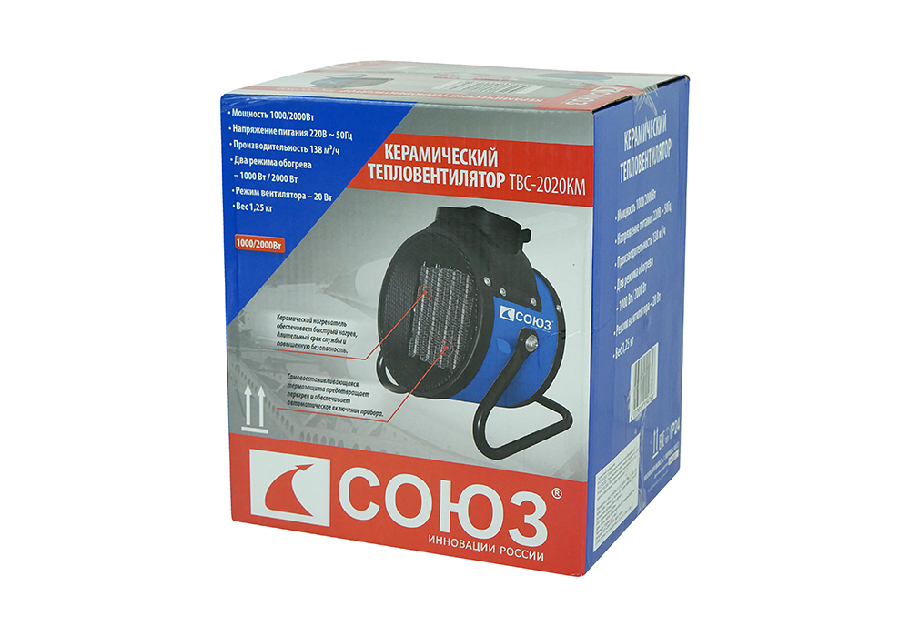 СОЮЗ ТВС-2020КМ — мобильный керамический обогреватель мощностью 2Вт и производительностью воздушного потока 138 м3 / ч. Предназначен для временного или постоянного обогрева жилых, производственных и вспомогательных помещений площадью до 30 м2. Особенность модели — применение в конструкции металлокерамического нагревательного элемента, благодаря большой площади теплоотдающей поверхности которого, гарантируется быстрый нагрев. Обогреватель не сушит воздух и не выделяет вредных веществ. Для того, чтобы обеспечить высокую производительность воздушного потока, проходящего через нагревательный элемент и ускорить циркуляцию нагретого воздуха в помещении, обогреватель оснащен встроенным мощным вентилятором. Управление устройством осуществляется регулятором, расположенным на верхней панели. С его помощью, пользователь выбирает один из трех режимов работы: вентиляция без нагрева / теплый обдув / горячий обдув. Безопасность использования обеспечивает встроенная термозащита, автоматически выключающая нагревательный элемент при достижении критической температуры. При этом, вентилятор прибора продолжит работу, предохраняя внутренние части от перегрева. Автоматическое включение произойдет при остывании до рабочей температуры. Предусмотрена возможность наклона корпуса обогревателя в вертикальной плоскости относительно поверхности, на которой он установлен, что позволяет направлять воздушный поток в соответствии с пожеланиями пользователя. Случайное опрокидывание устройства предотвращает широкая опорная подошва по его периметру.