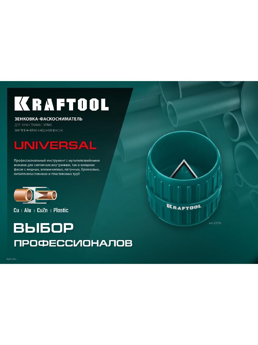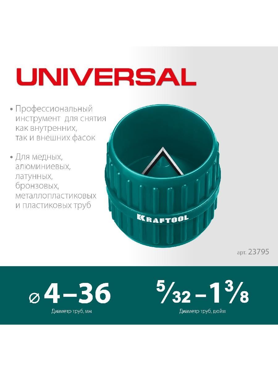 Универсальный внутренний и внешний фаскосниматель для медных, алюминиевых, латунных, бронзовых, металлопластиковых и пластиковых труб. Благодаря высокоточным мультилезвийным ножам, изготовленым из закаленной инструментальной стали, обеспечивает быстрое и точное снятие фаски