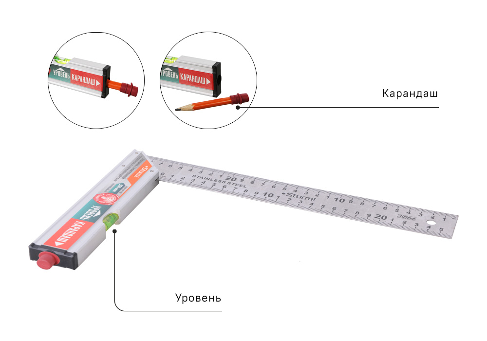 Переход от замера к разметке и обратно стал максимально быстрым, что в разы экономит время в процессе работы. Крепление осуществляется специально разработанной резиновой втулкой, которая надёжно удерживает карандаш, а так же позволяет его быстро извлечь и вернуть на место, исключая возможную потерю. Колба пузырькового уровня из ударопрочного плексигласа, полотно из нержавеющей стали с антикоррозийным покрытием, гравированная шкала устойчива в внешнему воздействию и сохранению точных показаний