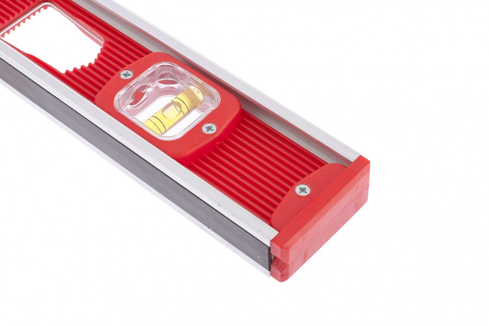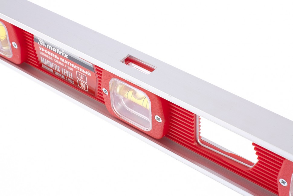 Корпус уровня изготовлен из ударопрочной пластмассы с алюминиевым каркасом. В корпус инструмента встроены магниты для фиксации на металлических поверхностях. Модель имеет три акриловых глазка для проверки отклонений по горизонтали и вертикали. Точность измерений – 1 мм м (0,057 градуса).